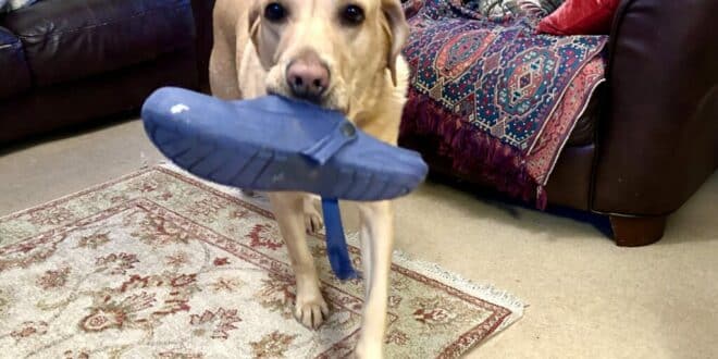 Odin and other dogs enjoy smelling a little shoe leather. He is a shoe connoisseur. It doesn’t matter if the shoes are small, big, or worn out. Sometimes boots can be used, too. Any shoe-like object will do. They are small, portable and make a wonderful accessory for the dog to wear around town. He can keep himself busy with this new find.